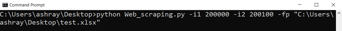 C:\Users\ashray\Desktop>python Web_scraping.py -i1 200000 -i2 200100 -fp “C:\Users\ashray\Desktop\test.xlsx”
